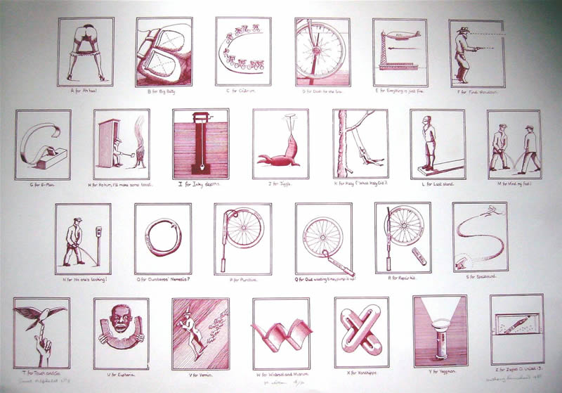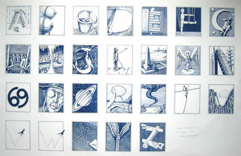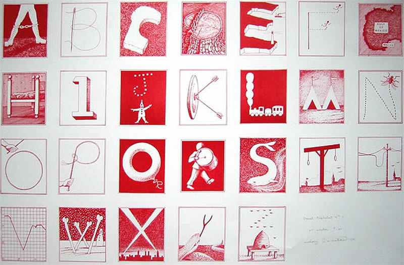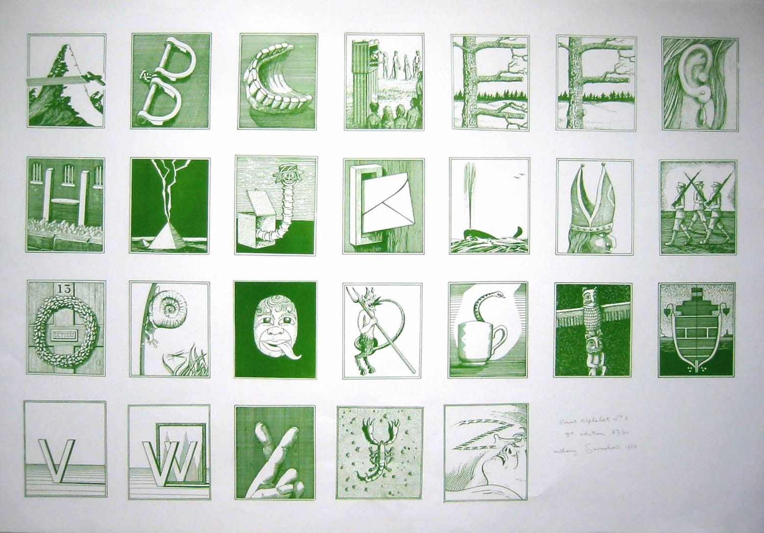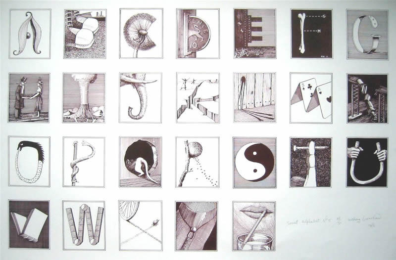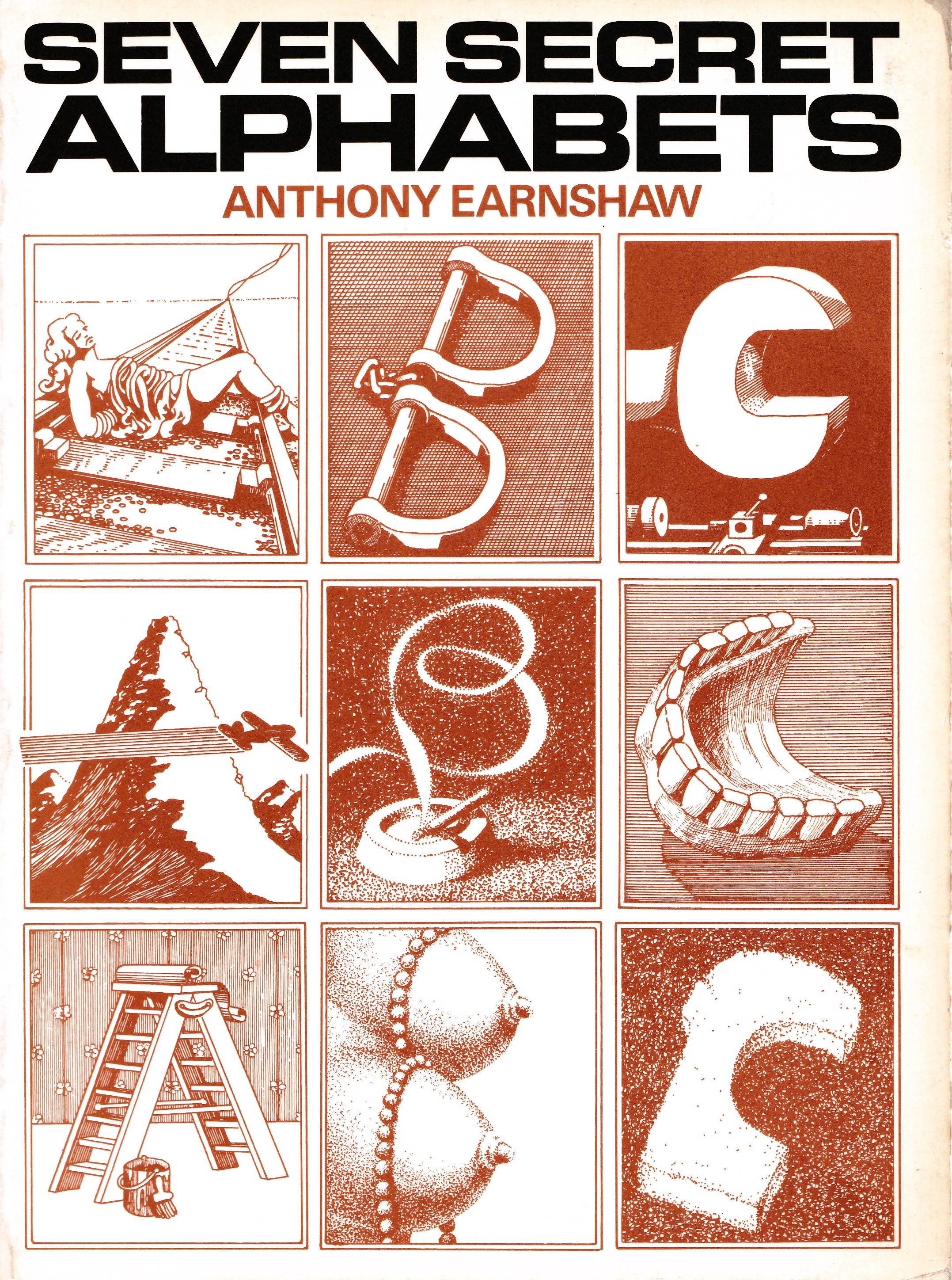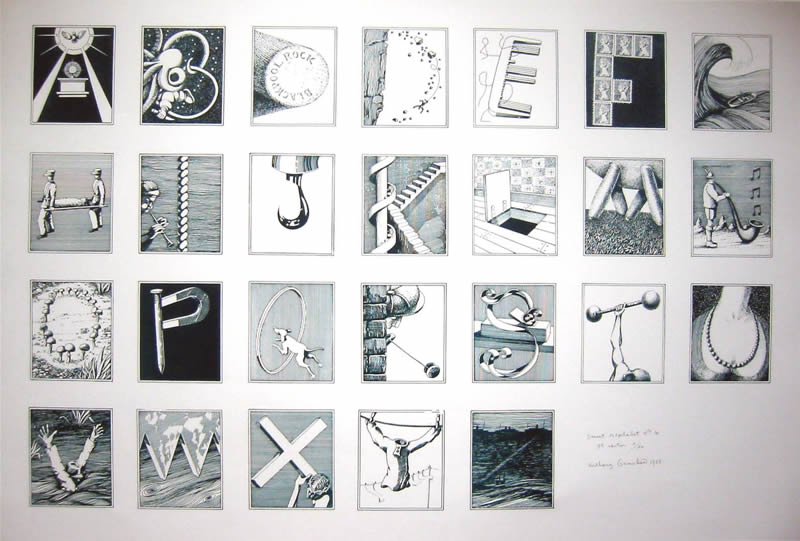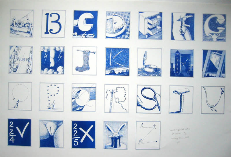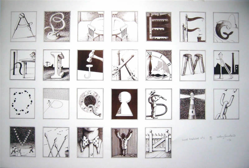 Seven Secret Alphabets, 1972 Jonathan Cape, London. Seven Secret Alphabets 1980, Jonathan Cape London (paperback edition) An Eighth Secret Alphabet, 1988 Harnboroug Parrot Press, Church Harnborough Secret Alphabet No. 1 1985, Lithoprint Secret Alphabet No. 2 1985, Lithoprint Secret Alphabet No.3 1985 Lithoprint Secret Alphaber No.4 1985 Lithoprint Secret Alphabet No 5, 1985 Lithoprint Secret Alphabet No 6, 1985 Lithoprint Secret Alphabet No 7 1985 Lithoprint Secret Alphabet No 8, 1985 Lithoprint page from Seven Secret Alphabets, Alphabet No.3 page from Seven Secret Alphabets, Alphabet No.7 Letter 'A' Alphabet No. 3, 1971, pen and ink Letter 'F' Alphabet No.4, 1971 pen and ink Letter 'L' Alphabet No. 4, 1971, pen and ink Letter 'I' Aphabet No. 5, pen and ink, 1971 Letter 'U' Alphabet No. 7, 1971, pen and ink Letter 'R' Alphabet No. 1, 1971 pen and ink Letter 'S' Alphabet No.3, 1971 pen and ink Letter 'E' Alphabet No.2, 1971 pen and ink Letter 'M' Alphabet No.4, 1971 pen and ink Letter 'O' Alphabet No. 4, 1971 pen and ink Letter 'A' Alphabet No. 1, 1971 pen and ink Letter 'N' Alphabet No.1, 1971 pen and ink Letter'R" Alphabet No. 1, 1971 pen and ink Letter 'Y' Alphabet No. 3, 1971 pen and ink